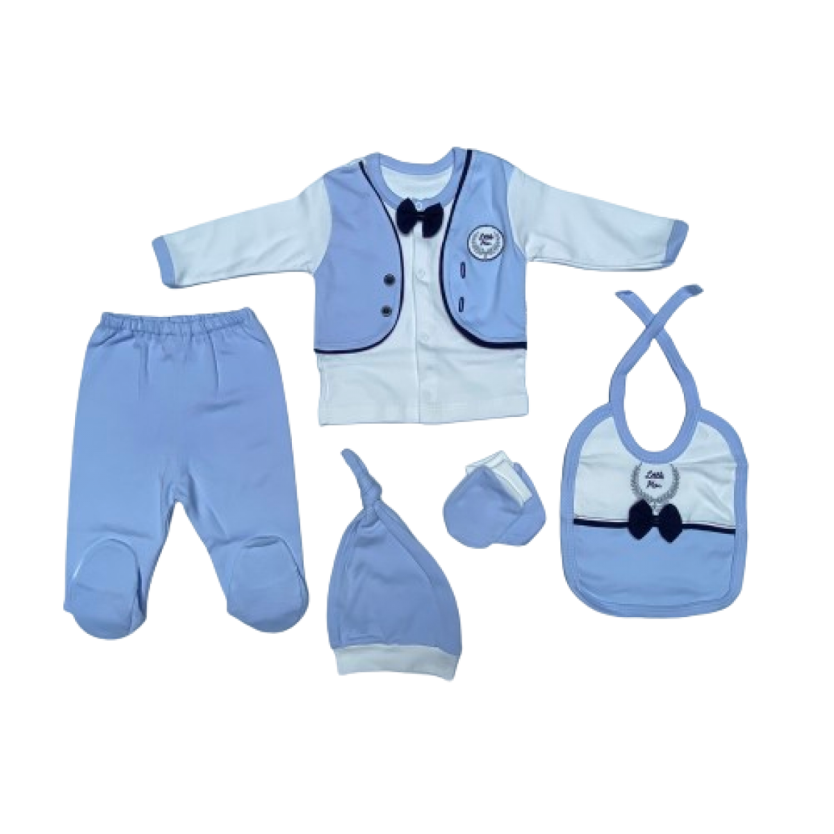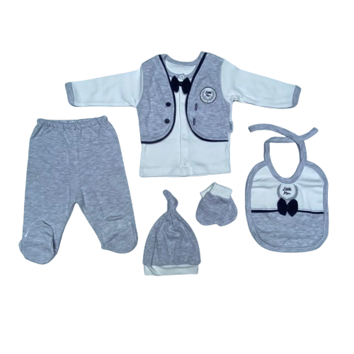 591 LITTLE MAN NAKISLI SAHTE YELEKLI PAPYONLU 5'LI YENIDOGAN SET 0-3 AY